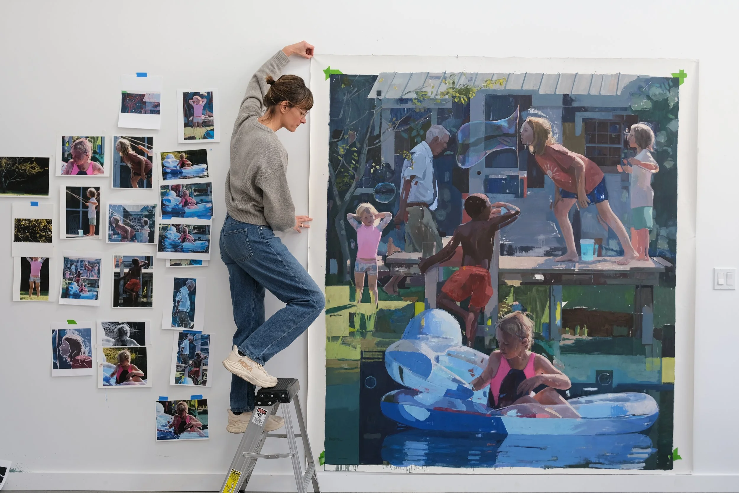 I’m in the middle of a few large paintings right now, working through a series of figurative scenes drawn from my life. I’m thinking about light moving through rooms, about children passing in and out of view, and about how memory can compresses time into a single picture.